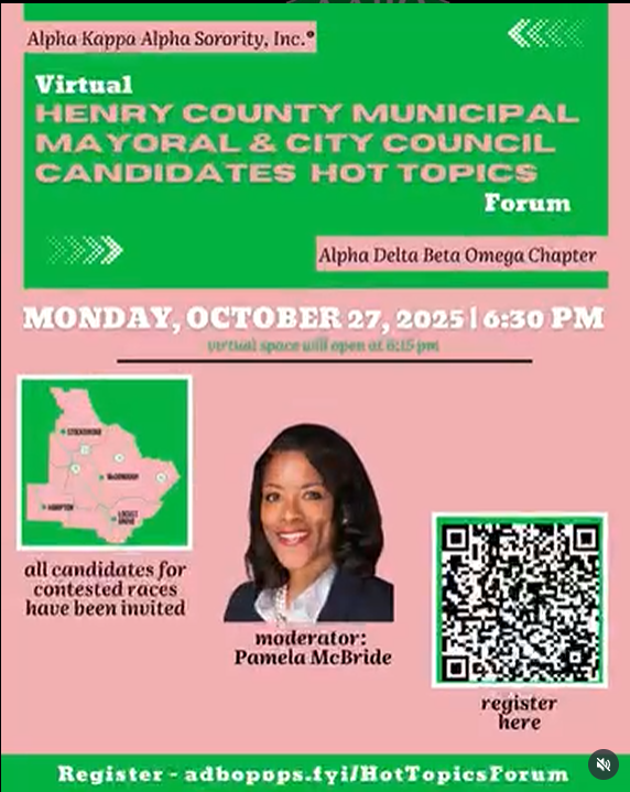 AKA Hot Topics Candidate Forum đ Monday, October 27 | 6:30 p.m. (Virtual Room Opens at 6:15 p.m.)đ Online Event â Register at adbopops.fyi/HotTopicsForum Breaking News! đď¸The Alpha Kappa Alpha Sorority, IncorporatedÂŽ Alpha Delta Beta Omega Chapter has invited all candidates in contested races for Mayor and City Council across McDonough, Hampton, Stockbridge, and Locust […]