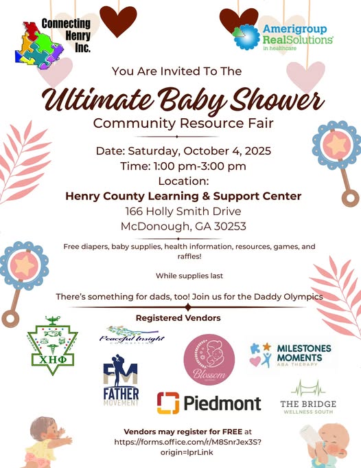 Connecting Henry is hosting the Ultimate Baby Shower, a community resource fair! Date: Saturday, October 4, 2025 Time: 1PM-3PM Location: Henry County Learning & Support Center 166 Holly Smith Drive, McDonough, GA 30253 Free diapers, baby supplies, health information, resources, games, and raffles - While supplies last And for dad join in for the Daddy […]