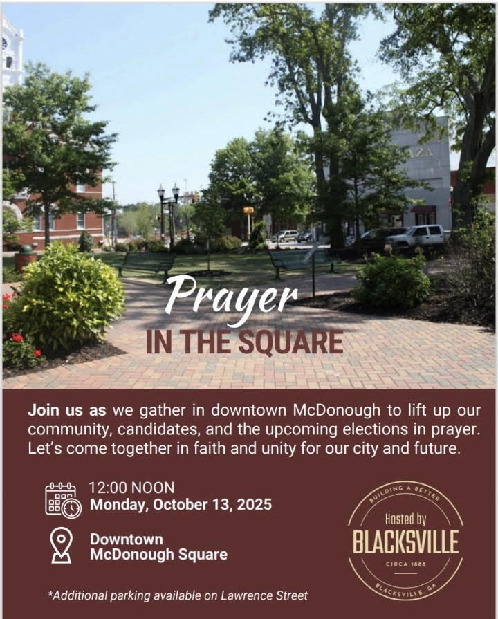 Description:Come together in faith and unity for Prayer in the Square, a community gathering in the heart of downtown McDonough. Weâll lift up our city, local candidates, and the upcoming elections in prayer â standing together in faith and unity for our city and future. Date: Monday, October 13, 2025Time: 12:00 NoonLocation: Downtown McDonough Square […]